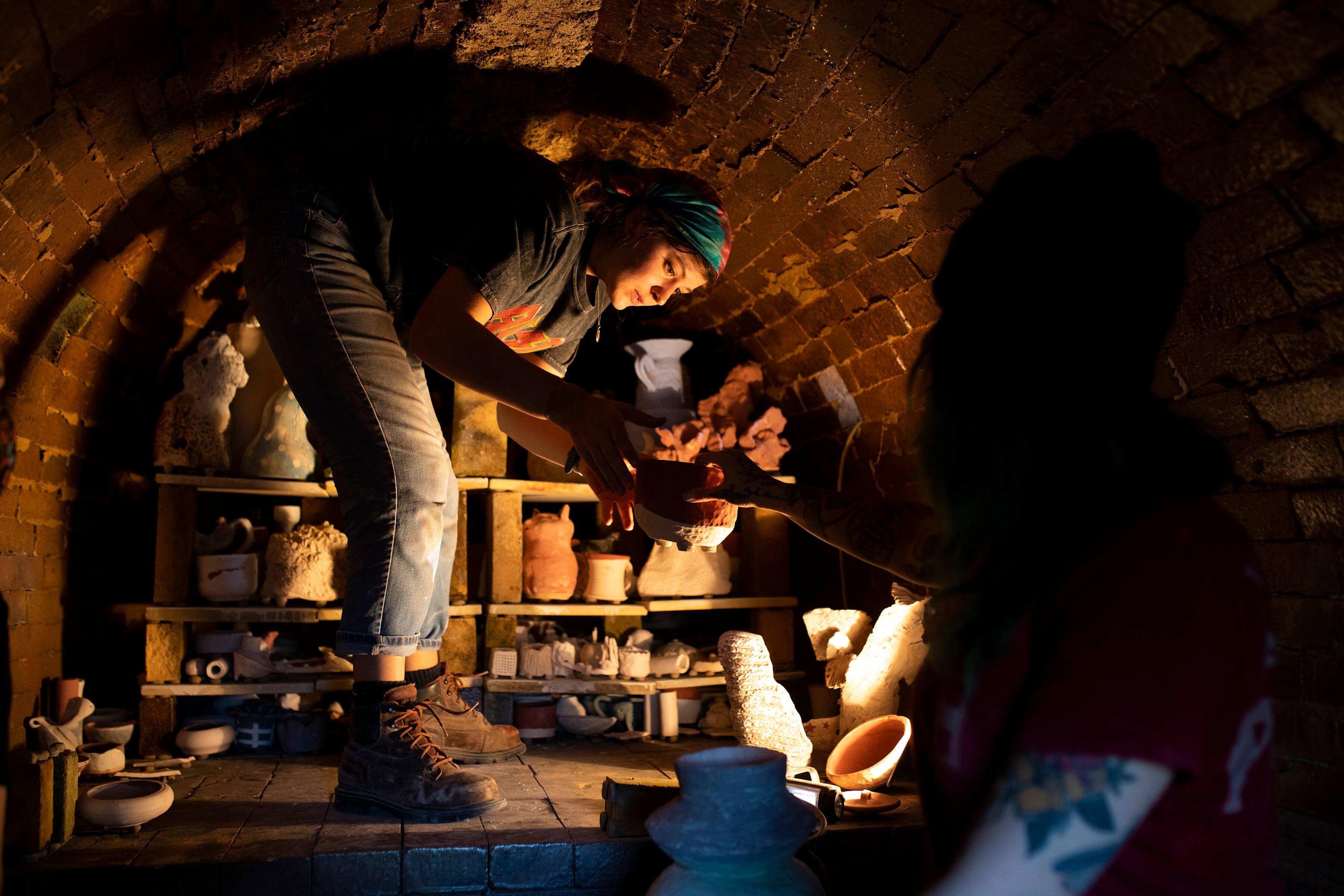 The anagama kiln is typically loaded with a combination of pottery and firewood, with the pottery placed on shelves within the kiln. The kiln is then sealed and the firing process begins. The temperature inside the kiln is controlled by adjusting the amount of air that enters the kiln and the rate at which the firewood is added.